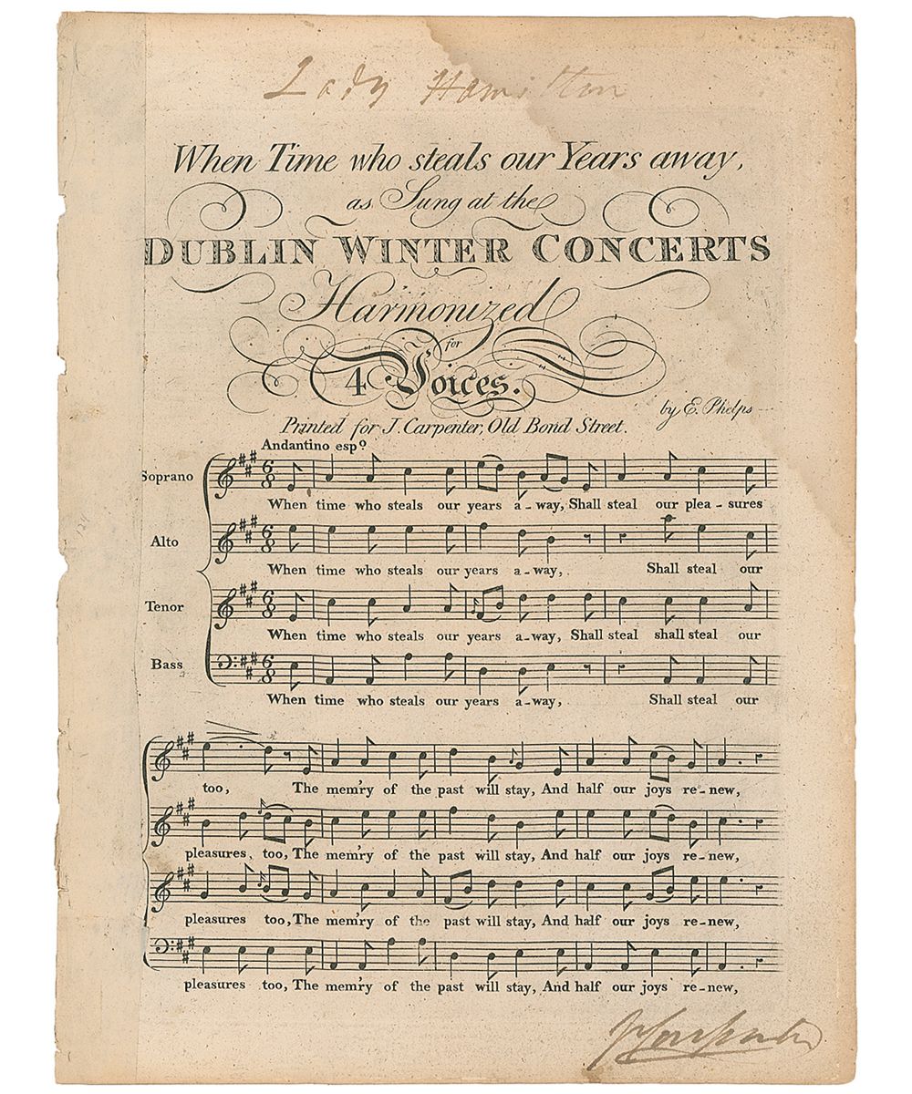 Born the daughter of a humble blacksmith, the model, entertainer, and courtesan Emma Hamilton (née Amy Lyon, 1761) ascended through the ranks of British society to become the mistress to Lord Admiral Horatio Nelson. Following Nelson’s death in battle in 1805, Hamilton sunk deeply into debt, was sentenced to debtor’s prison, eventually fled to France to escape her creditors, and died in poverty. Sheet music for ‘When Time who steals our Years away, as Sung at the Dublin Winter Concerts, Harmonized for 4 Voices,’ from Hamilton’s personal collection, 9.5 x 12.5, one page both sides. Music bears Hamilton’s ownership signature to the top, “Lady Hamilton.” In very good condition, with a central horizontal fold, damp staining to the upper right, multiple dings to the left edge, and a binding sheet affixed to the left edge. Lady Hamilton was very keen on her piano, harp, and music lessons given to her for years in Naples.