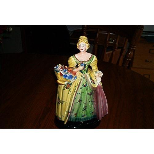 Featuring a beautifully, decorated, woman figurine that was made in Italy, and numbered 331 out of 603. Made of Porcelain. Dated around the 1940's or 50's. She is decorated with a lovely bright yellow background, designed dress, with burgandy and blue flowers. The front of her dress and bodice has a green and burgandy with yellow background, with tiny yellow, blue, green, and burgandy flowers. You can also see one of her shoes. She is standing on a black porcelain base, carrying a beautiful basket of danity flowers in the same colors of the flowers in her dress. She is also holding 3 colorful flowers in her hand. She also has beautiful facial designs. Very Victorian Lady. Bottom of base states (in black): ITALY - 331/603. She stands 12 1/2 inches tall. Base measures 6 1/2 inches long by 4 3/4 inches wide. The back of her dress is designed with a bubble like style. She reminds you of a Royal Dalton Figurine. No chips, cracks, etc. Excellent to mint condition. She would decorate any room or curio cabinet.