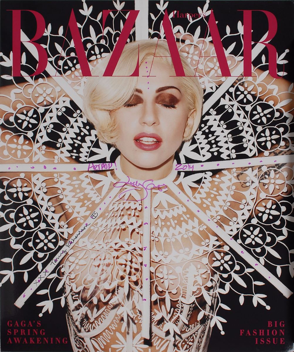 Rare and extraordinary enormous color glossy 34.75 x 42 photo of the March 2014 cover of Harper’s Bazaar, signed across the middle in purple felt tip, “…Artpop! Lady Gaga 2014…,” and in the lower left in black felt tip by the photographer, “Terry Richardson.” Mounted on foamboard. In fine condition. Oversized. Only a handful of these oversized prints were created and sold to benefit Lady Gaga’s charity along with the clothes she wore in the photo shoot.