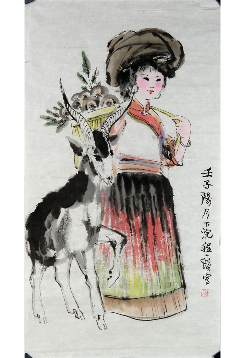 Chinese lady and goat, Chinese ink and watercolour on paper, signed Cheng Shi Fa (1921 -2007) with red seal; 90 cm x 49 cm; Provenance: T. Ng Collection Toronto