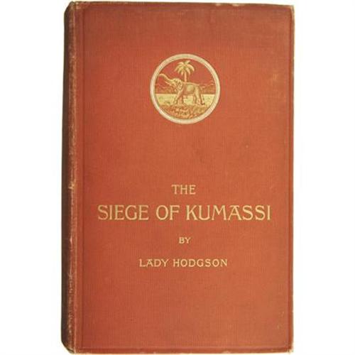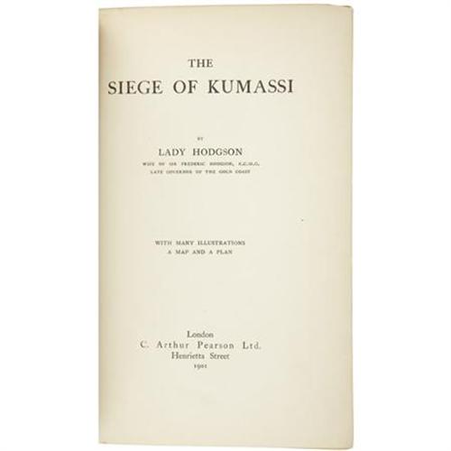 <B>Lady [Mary Alice Young] Hodgson. </B></I><B><I>The Siege of Kumassi</B></I></B></I><B>.</B></I> By Lady Hodgson. With Many Illustrations a Map and a Plan. London: C. Arthur Pearson, 1901. <BR><BR>Octavo. 365 pages. [2, publisher's ads dated Spring 1901]. Thirty-two inserted black and white photographic illustrations including frontispiece portrait and two inserted maps. Index.<BR>Publisher's red cloth covers and spine lettered in gilt, with elephant and palm in roundel stamped in gilt on the front cover. Top edge gilt. Darkened spine, slightly rubbed joints and edges. Altogether a very good copy. <BR><BR>Mary Alice Young Hodgson, the wife of Sir Frederic M. Hodgson, recounts her time in Africa as the wife of the British Colonial Governor of the Gold Coast. The book focuses upon Kumassi, where the Ashanti rising occurred in 1900.<BR><BR><b>Shipping:</b> Books & Catalogs (<a target="_blank" href="http://www.heritageauctions.com/common/shipping.php">view shipping information</a>)