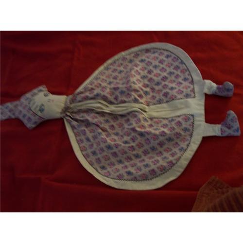 I have had a collection of these for a number of years but need to sell some due to lack of room.This one has a great embroidered face with fancy stitching around bag.Does have one small hole on top of hanger where someone hung it probably on a nail before I purchased it.Great floral material.Measures approx.43" long from top of hanger to feet.Made to look like laces in the shoes.I have three more I am listing if you love these laundry bags as much as I do.
