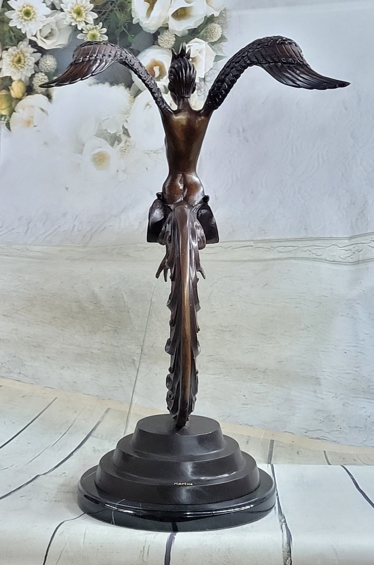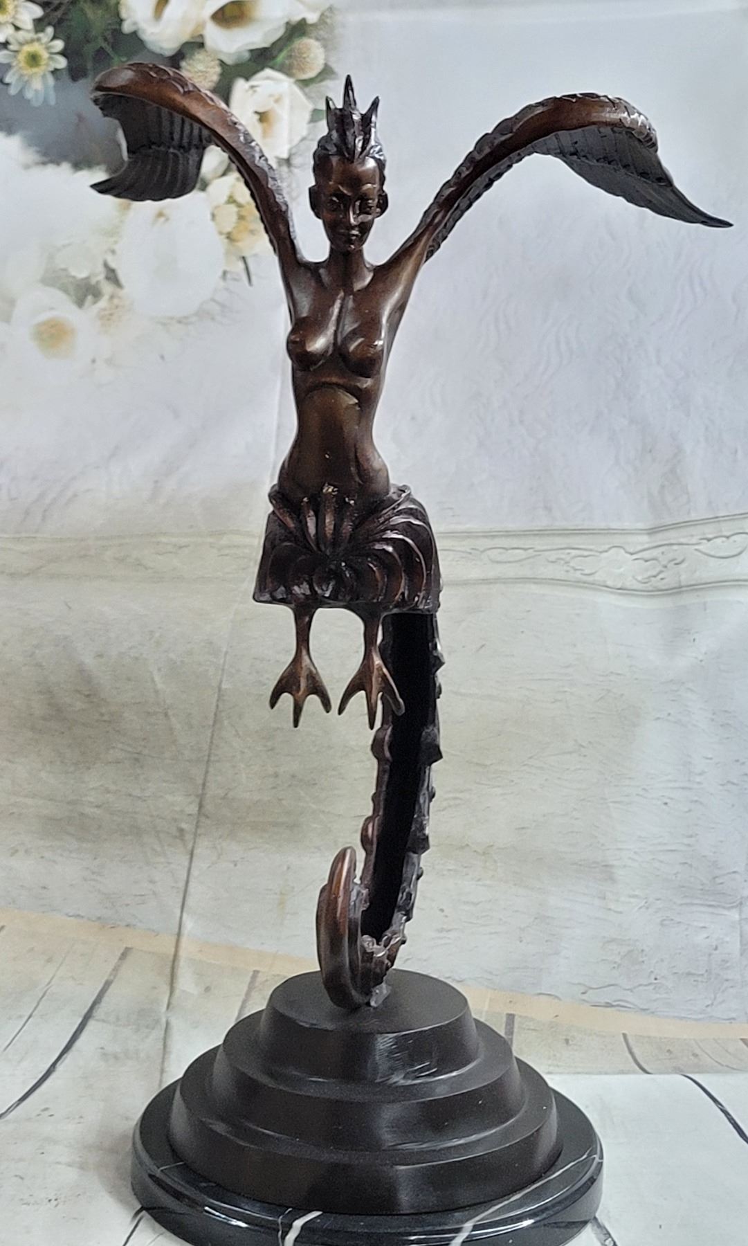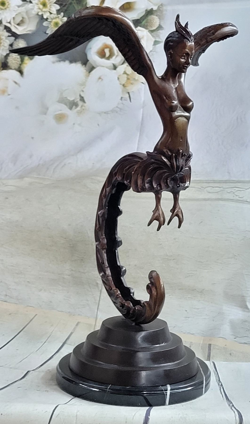 This sculpture is mounted on a marble base and tapering up rests her long and elegant tail. Her naked upper torso is lean and curvaceous. Her face is exquisitely detailed and refined, her eyes sleek and her ethnicity resembles the Thai woman. On her head, three whimsical feathers extend from her hairline upwards. From where her arms would be stretched two big and beautifully details wings. Each feather is refined from the next one as they cascade down the wings. The sculpture has a brown patina. Dimensions: Height 24 X Width 13 inches. Weight: 19 LBS.