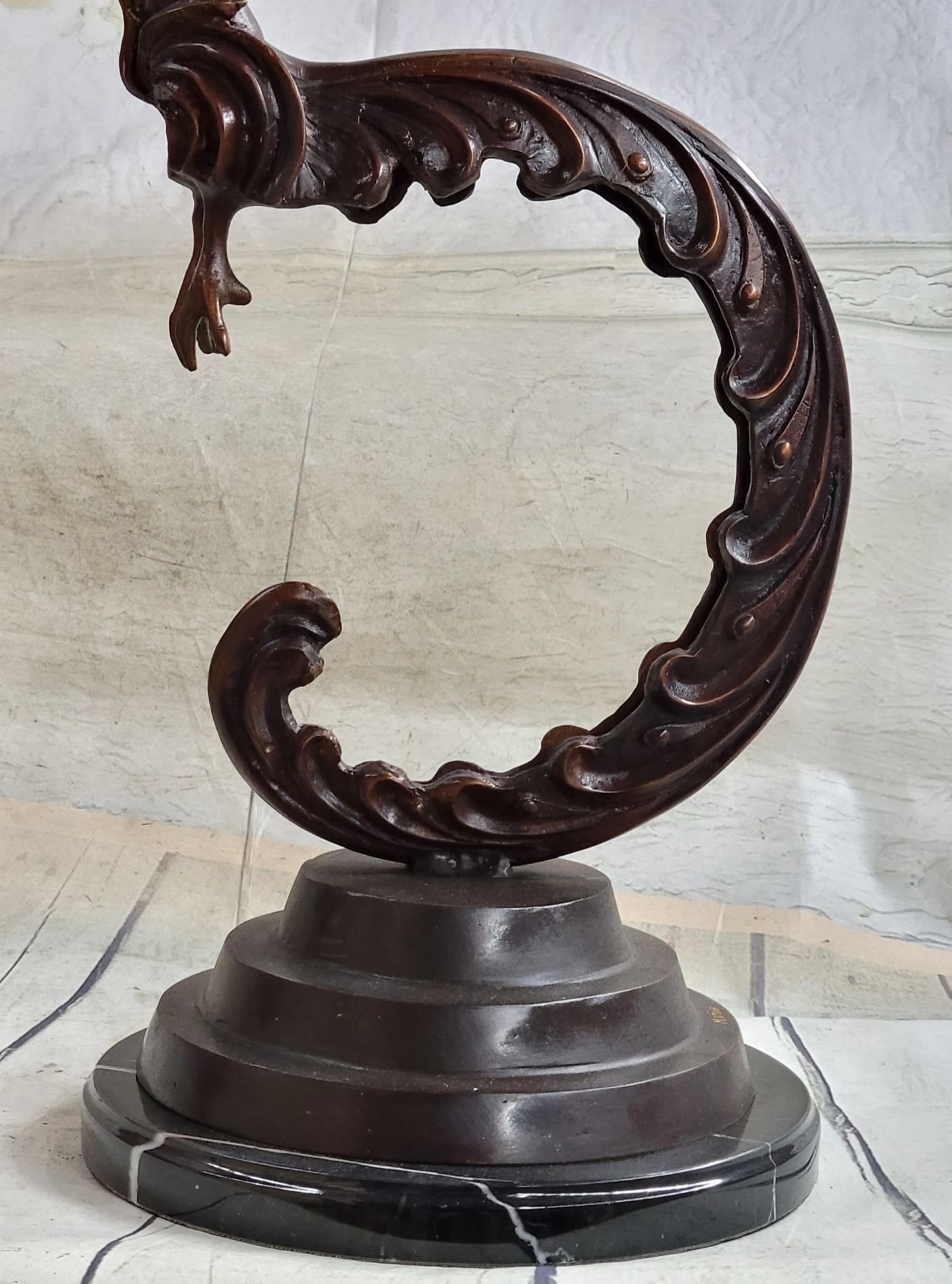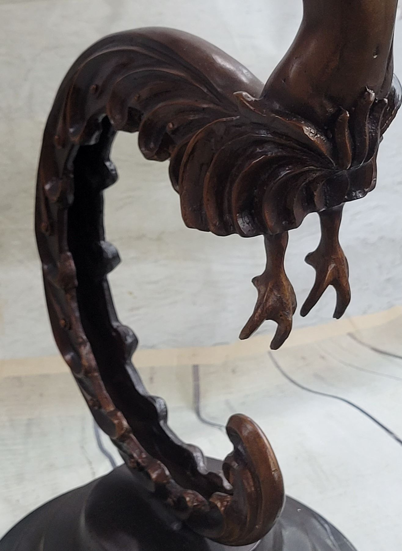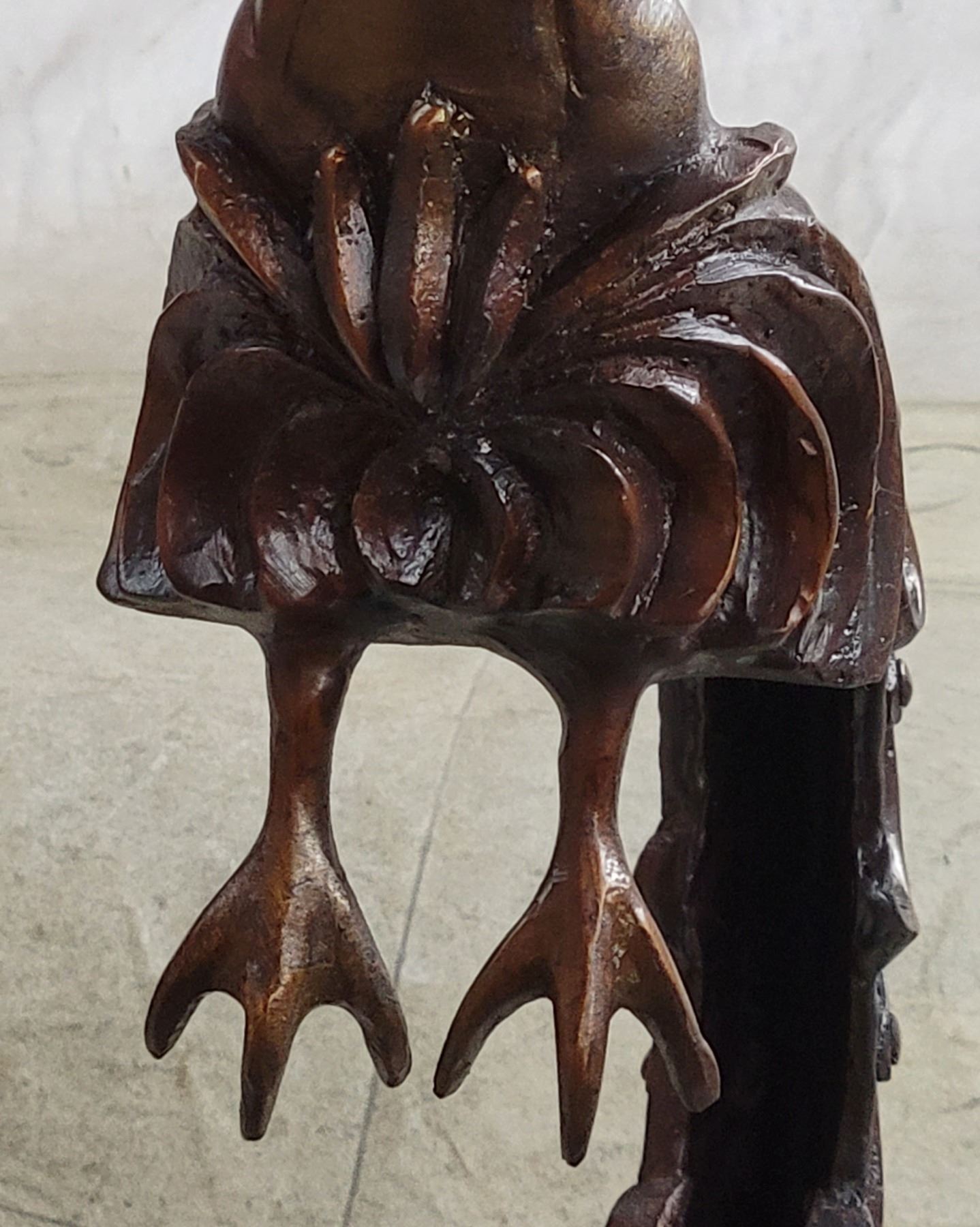 This sculpture is mounted on a marble base and tapering up rests her long and elegant tail. Her naked upper torso is lean and curvaceous. Her face is exquisitely detailed and refined, her eyes sleek and her ethnicity resembles the Thai woman. On her head, three whimsical feathers extend from her hairline upwards. From where her arms would be stretched two big and beautifully details wings. Each feather is refined from the next one as they cascade down the wings. The sculpture has a brown patina. Dimensions: Height 24 X Width 13 inches. Weight: 19 LBS.