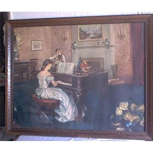 Print of a Lady playing the piano with a boy playing the violin. This is a very pretty picture and the frame is wood with a leather look. The frame has some damage on the bottom front edge of about 2.5 inches long. The painting measures 30.5 inches wide and 24.5 inches tall and is in very good condition with the exception of the above mentioned damage.