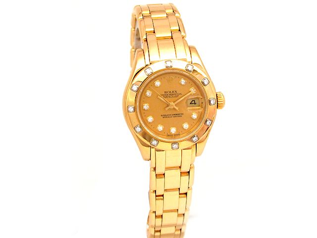 Lady Rolex 18k Yellow Gold Oyster Perpetual Pearlmaste **|**|** 29mm Lady Rolex 18k Yellow Gold Oyster Perpetual Pearlmaster Datejust Watch. Champagne 10R Diamond Dial. 18k Yellow Gold Bezel, 12-round Diamonds. 18k Yellow Gold Masterpiece Band. Style 69318. ; MSRP: $31500