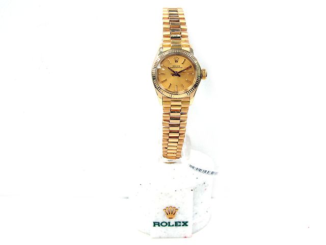 Lady Rolex 18k Yellow Gold Oyster Perpetual Watch **|**|** Lady Rolex 18k Yellow Gold Oyster Perpetual Watch. Champagne Dial. 18k Yellow Gold Fluted Bezel. 18k Yellow Gold President Band. ; MSRP: $10900