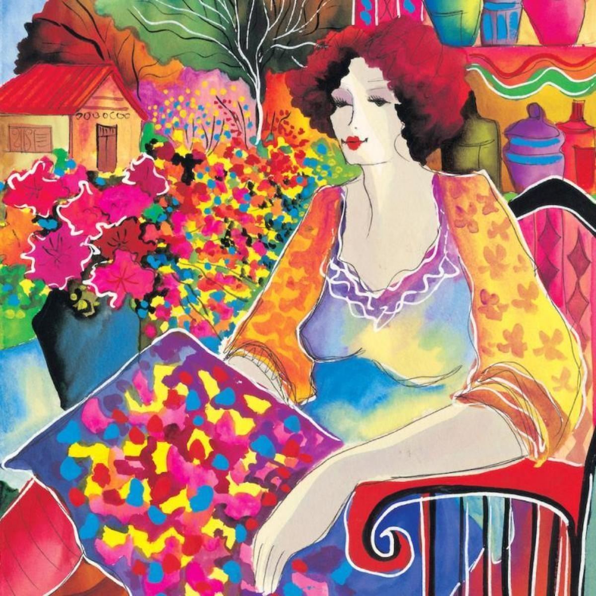 "Lady With Flower View" is a limited edition Giclee on Canvas by Patricia Govezensky. The piece is numbered, hand signed by the artist, and come with a letter of authenticity. Measures approximately 10" x 8".