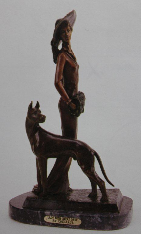 "Lady With Great Dane" Bronze Sculpture - After Chiparus - Museum Brown Finish - Mounted On Fine Italian Marble Base - Signed - Mint Condition - 20"H X 12"W - Lost Wax Cast Bronze