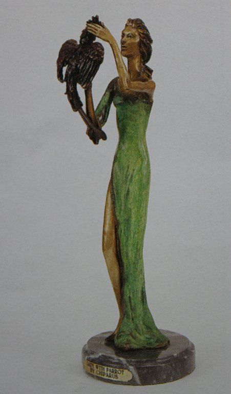 "Lady With Parrot" Bronze Sculpture - After Chiparus - Beautiful Color Patina - Mounted On A Fine Italian Marble Base - Beautifully Detailed - Signed - Mint Condition - 20"H X 6"W - Lost Wax Cast Bronze