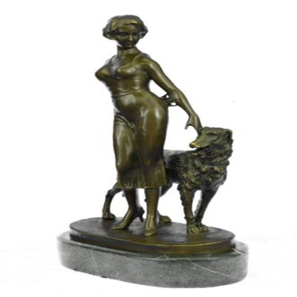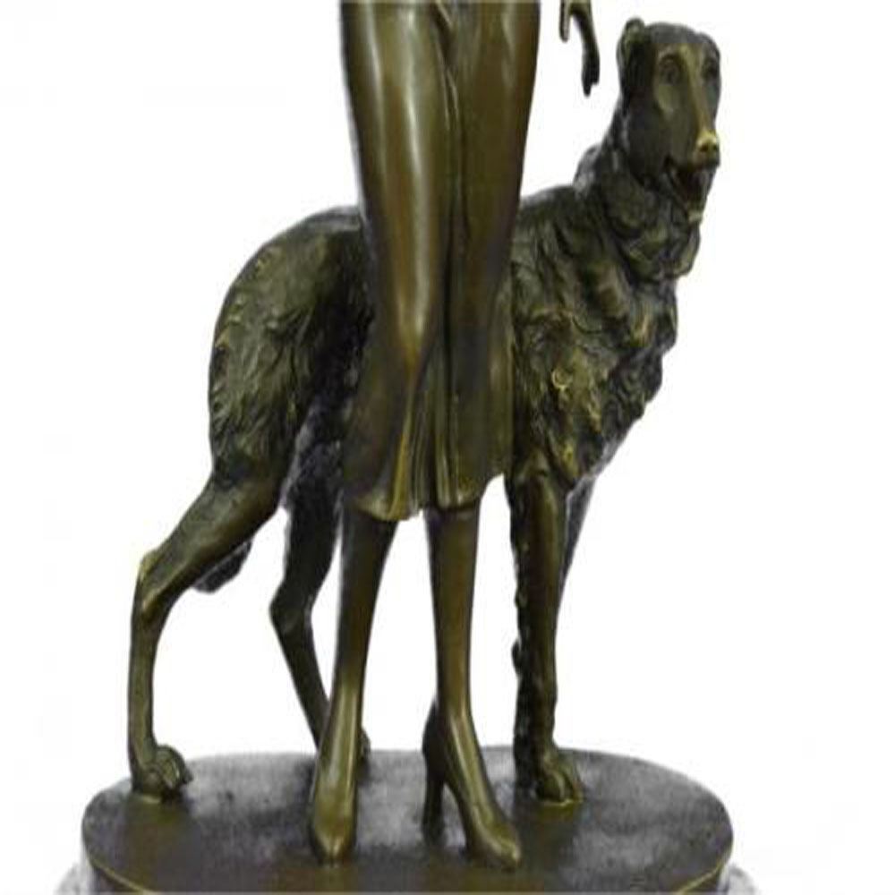 Refined and sophisticated, this classy woman stands in a comfortable and relaxed position. She places her arm behind her back and grabs onto her other arm, like a innocent child. Her hair is short and her style of clothes is reminiscent t of the 1950'S. She stand with her faithful borzoi behind her, she looks down wondering what he is getting into. She is a beautiful busty women with voluptuous curves. This definitely has Classic written all over it. This is a handmade Bronze Sculpture it was casted using the Lost Wax Method. Bronze Dimensions with Marble Base: Height 15 X Width 9 inches. Weight: 14 LBS.