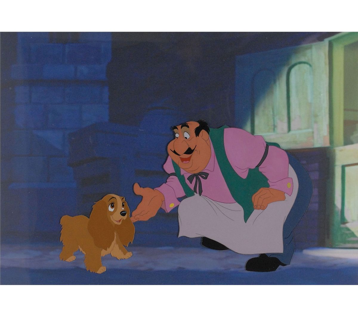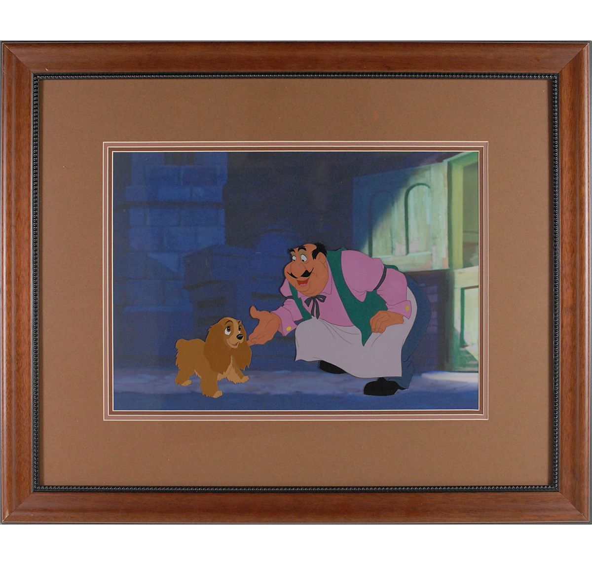 (Walt Disney Studios, 1955) Original production cels featuring Lady and Tony from Lady and the Tramp, showing Tony crouching down to greet the dog. The cels are placed on a laser copy background. Image measures 11 x 6.75, with a mat opening of 15.5 x 11. This piece is also framed to an overall size of 25.5 x 21. In fine condition.