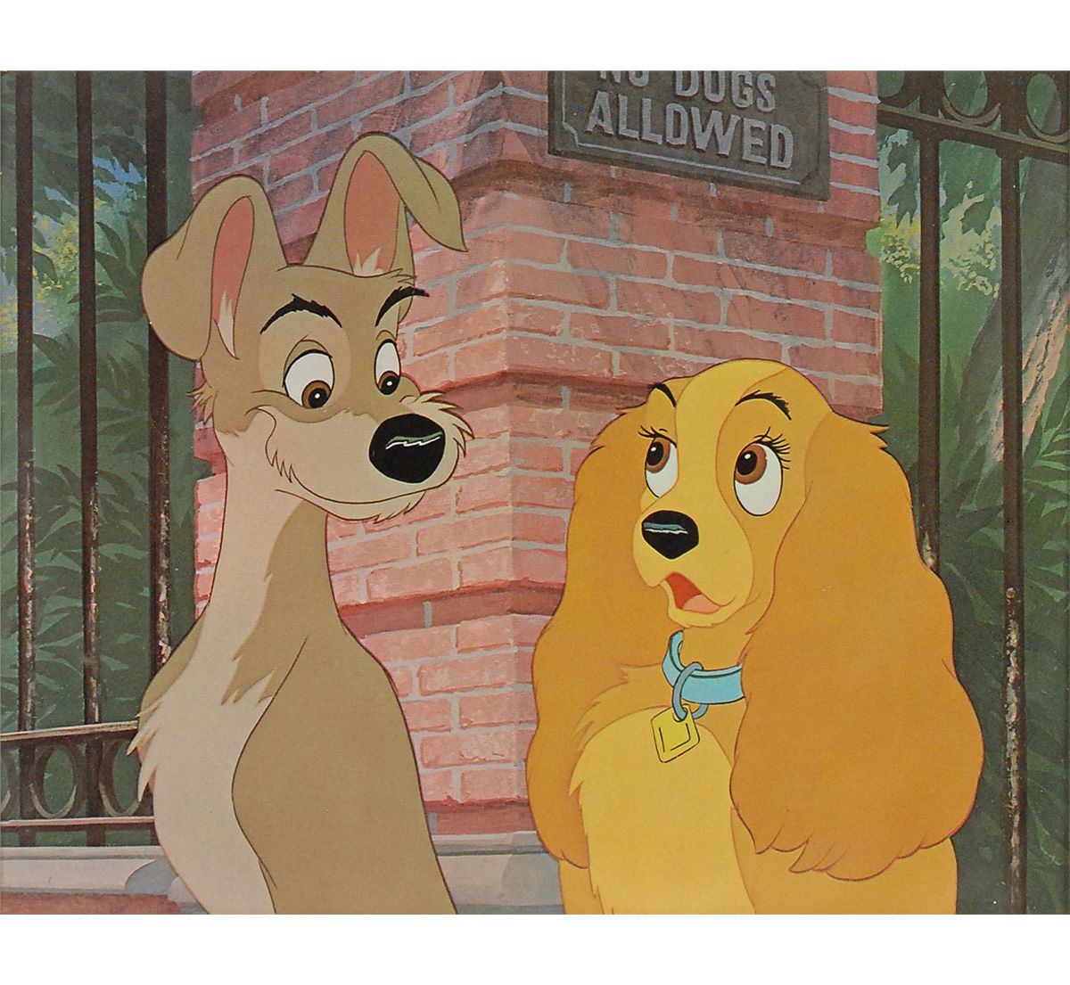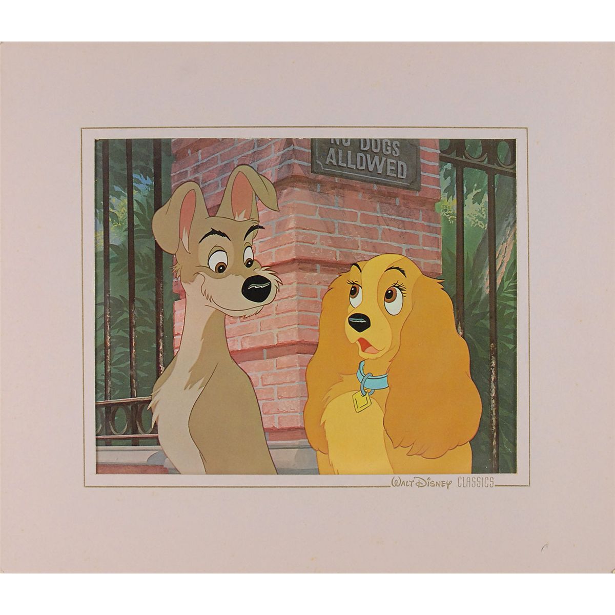 (Walt Disney Studios, Circa 1960s) Original dye transfer featuring Lady and Tramp from Lady and the Tramp. Mat opening on the transfer measures 9.5 x 7.5, with the original mat having an overall size of 14 x 12. Originally sold at Disneyland, the reverse of the mat bears its original Walt Disney Classics label. In fine condition.