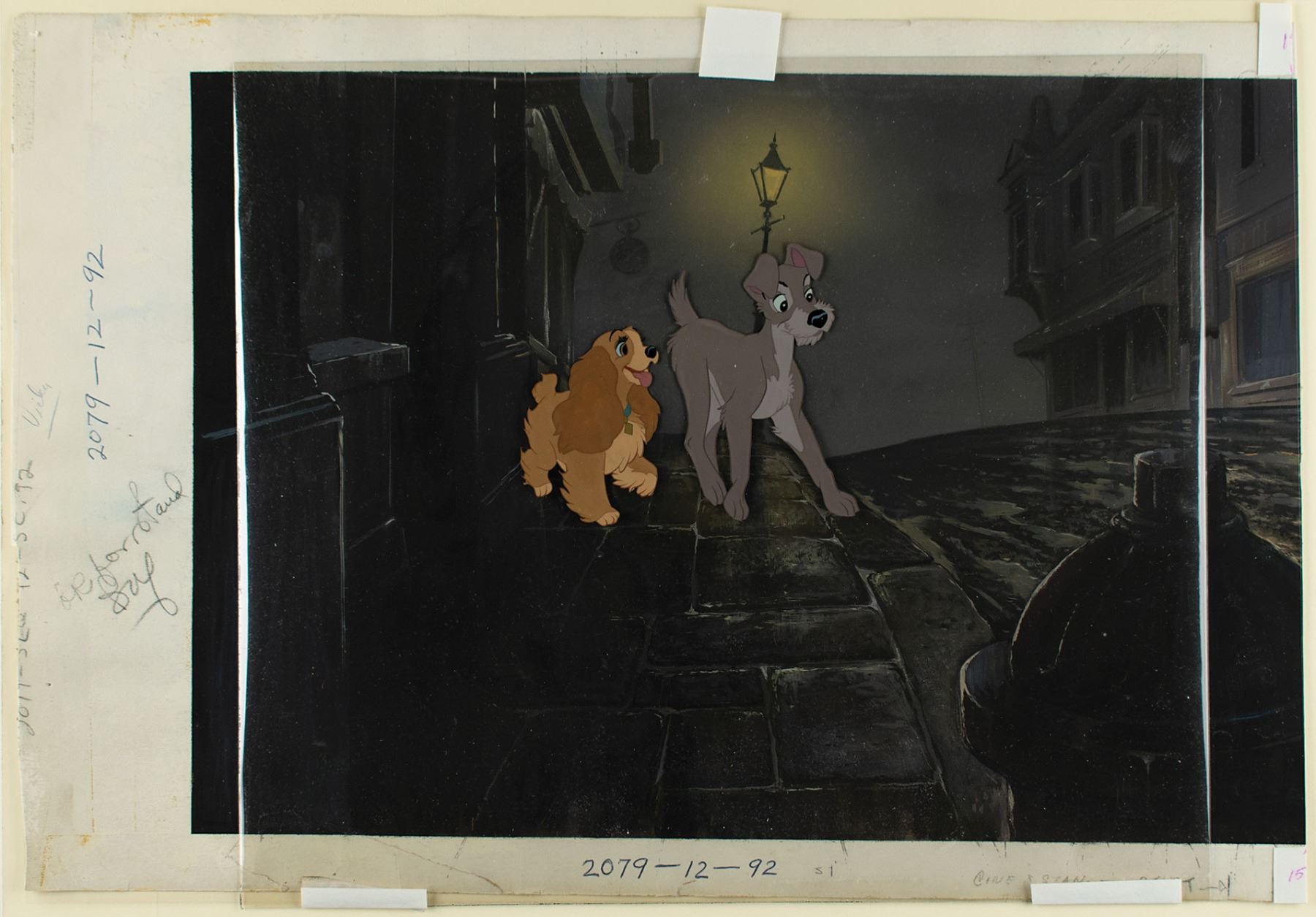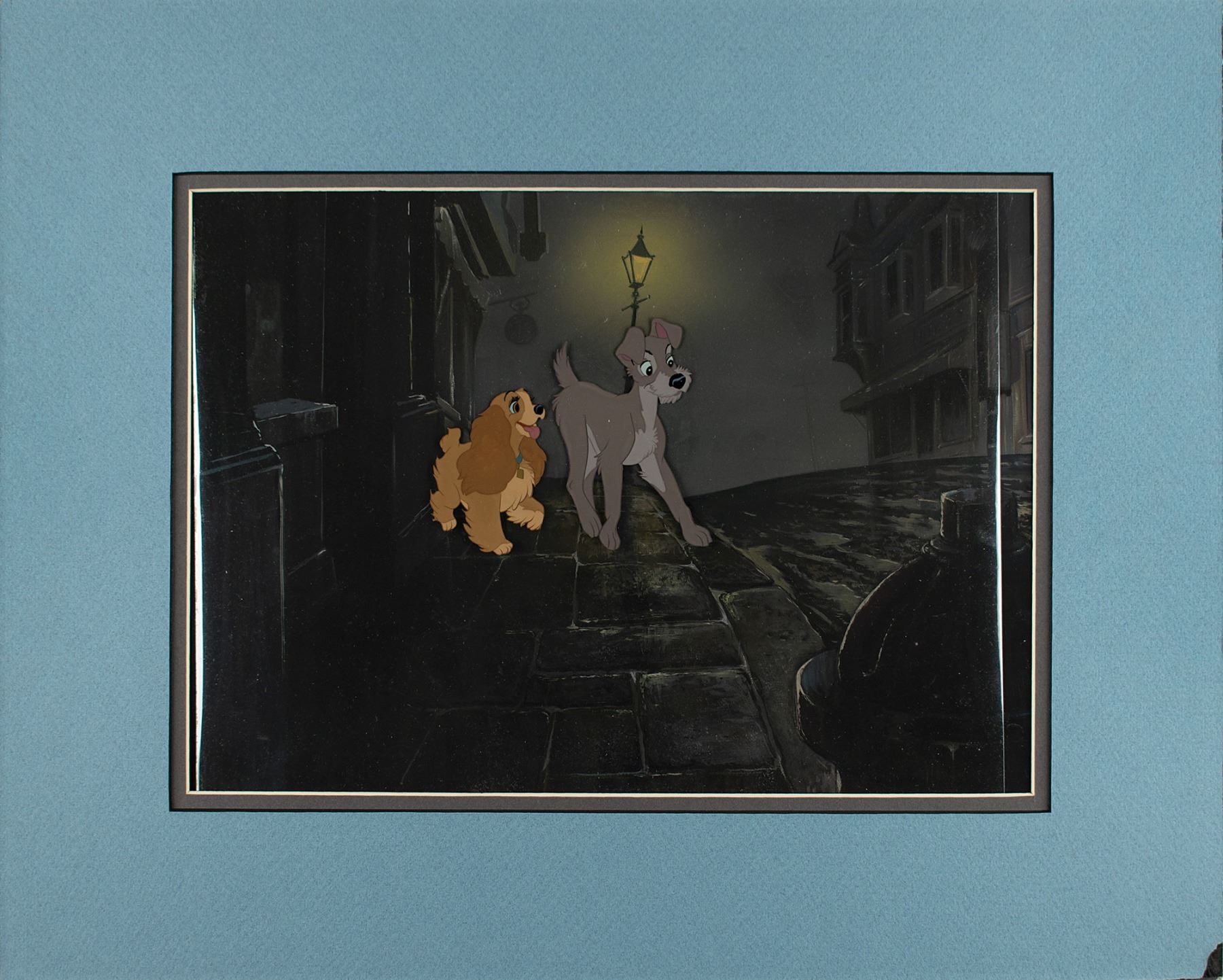 (Walt Disney Studios, 1955) Original production cels and production background from Lady and the Tramp, which shows the two title pooches strolling across a lantern-lit sidewalk at night. The cels are placed on an attractive production master background of the city at night prior to the classic 'Bella Notte' sequence. Character images measure 2 x 2.75 (Lady) and 2.5 x 3.75 (Tramp), with overall dimensions of 17.25 x 13.5. Double-matted to an overall size of 20 x 16. In fine condition.