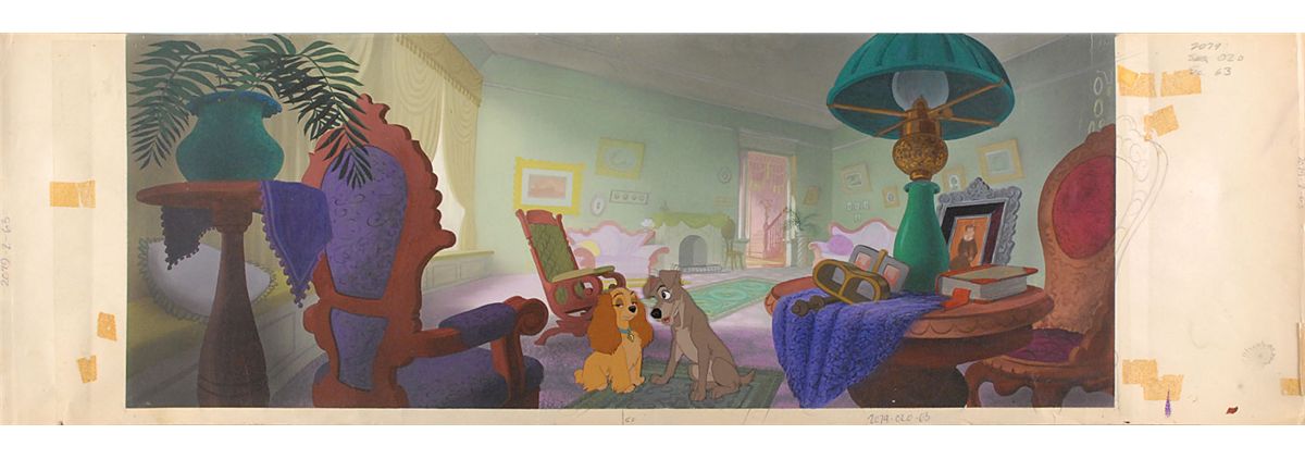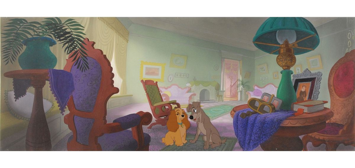 (Walt Disney Studios, 1955) Original production cel on a preliminary pan production background featuring Lady and Tramp from Lady and the Tramp, showing them close together. The cels are trimmed to image and placed on a hand-painted preliminary pan production background of an interior scene. Images measure 2.25 x 3 and 3.5 x 4, and the hand-painted production background measures 30.25 x 11.5, with an overall size of 40 x 12. In fine condition. This is a wonderful setup featuring the highly desirable and meticulously designed impressively large preliminary background.