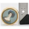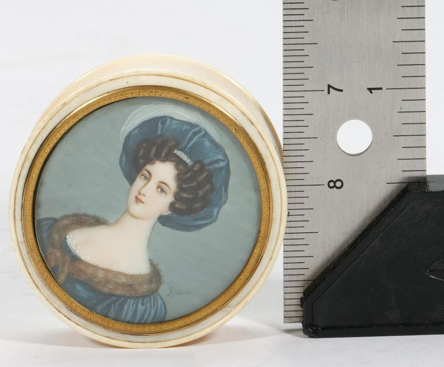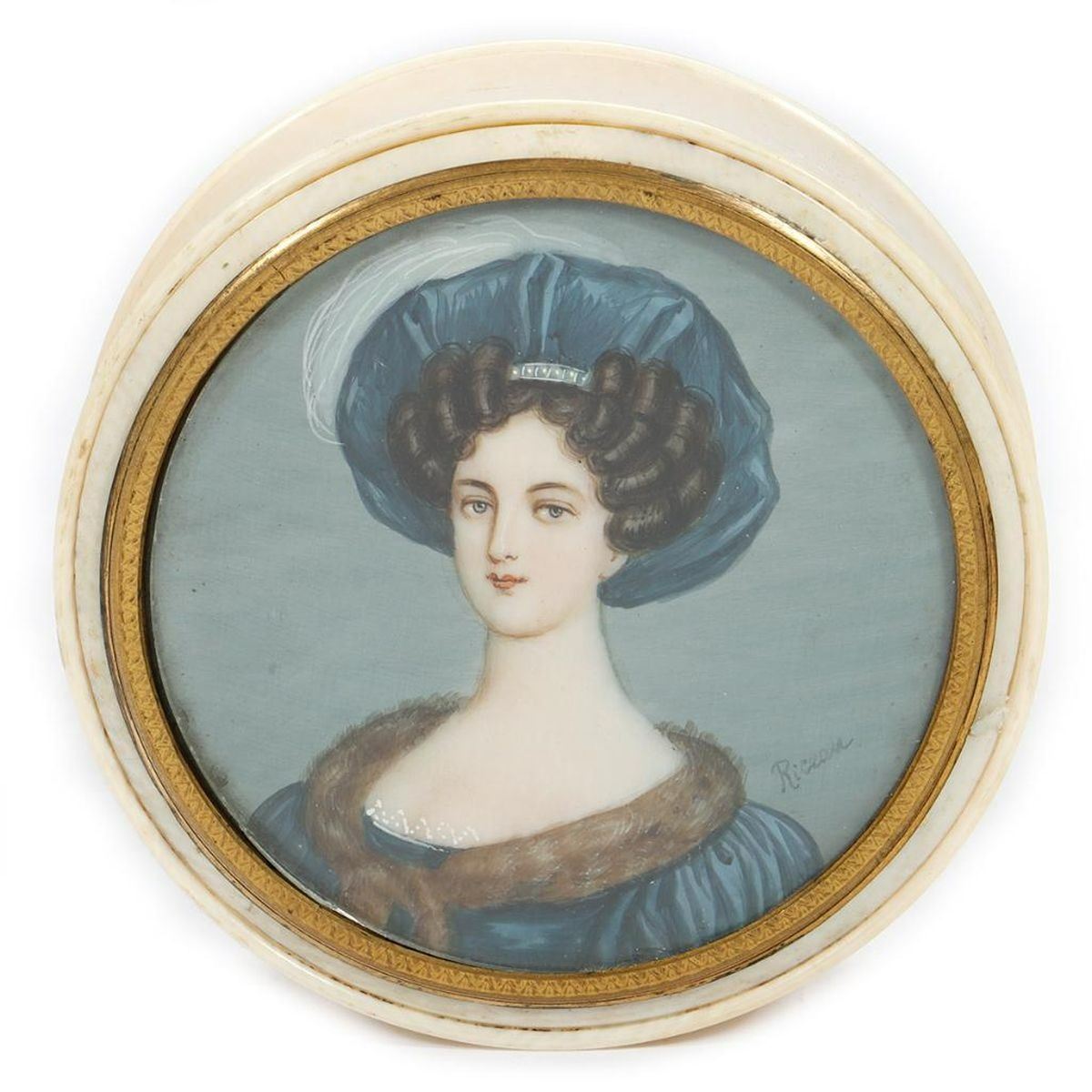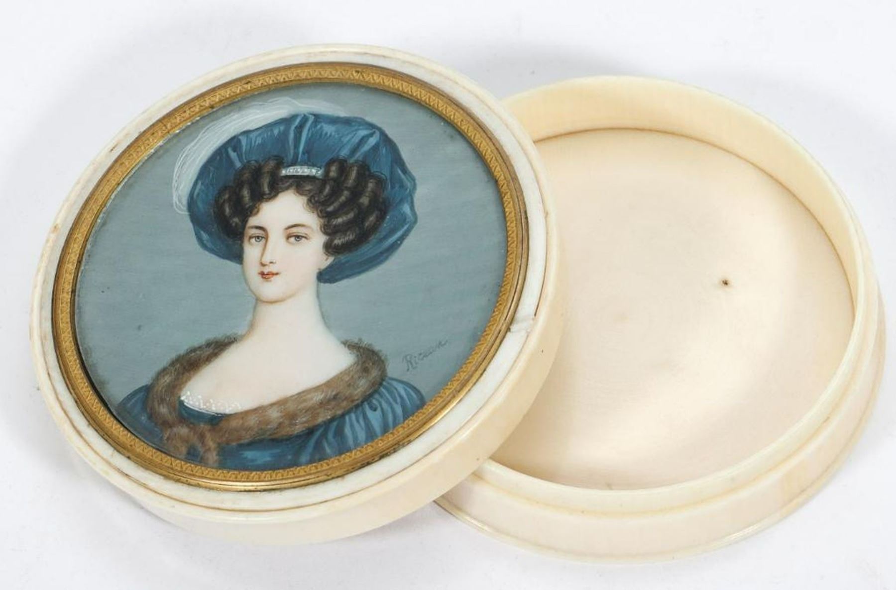 The box with a portrait of a lady in blue with fur collar, under glass. The portrait is signed above her shoulder (Riceau?). Diam. 2 3/4in. Condition: Portrait in good condition; small old repair to lid.