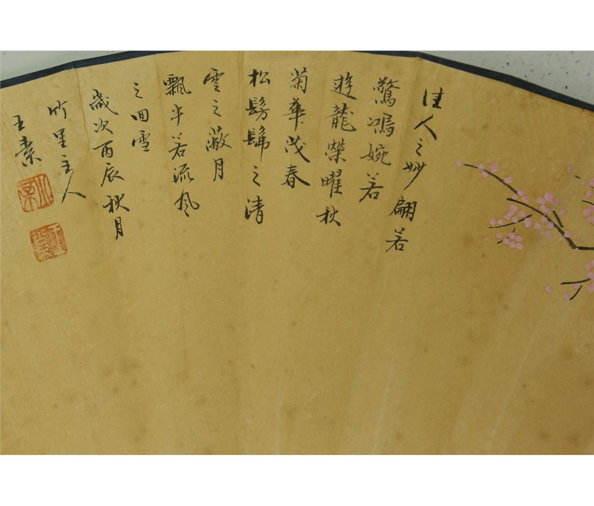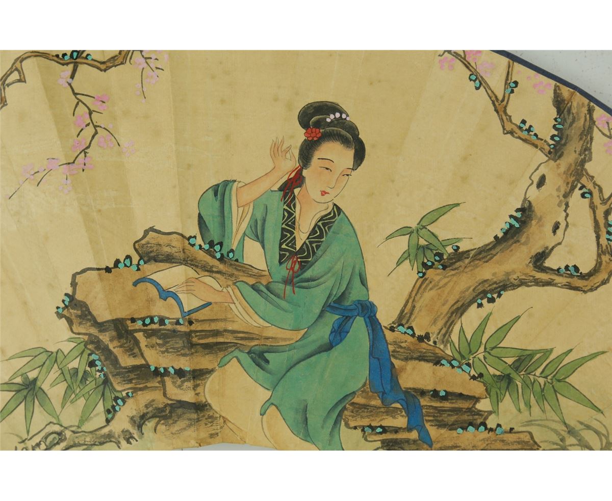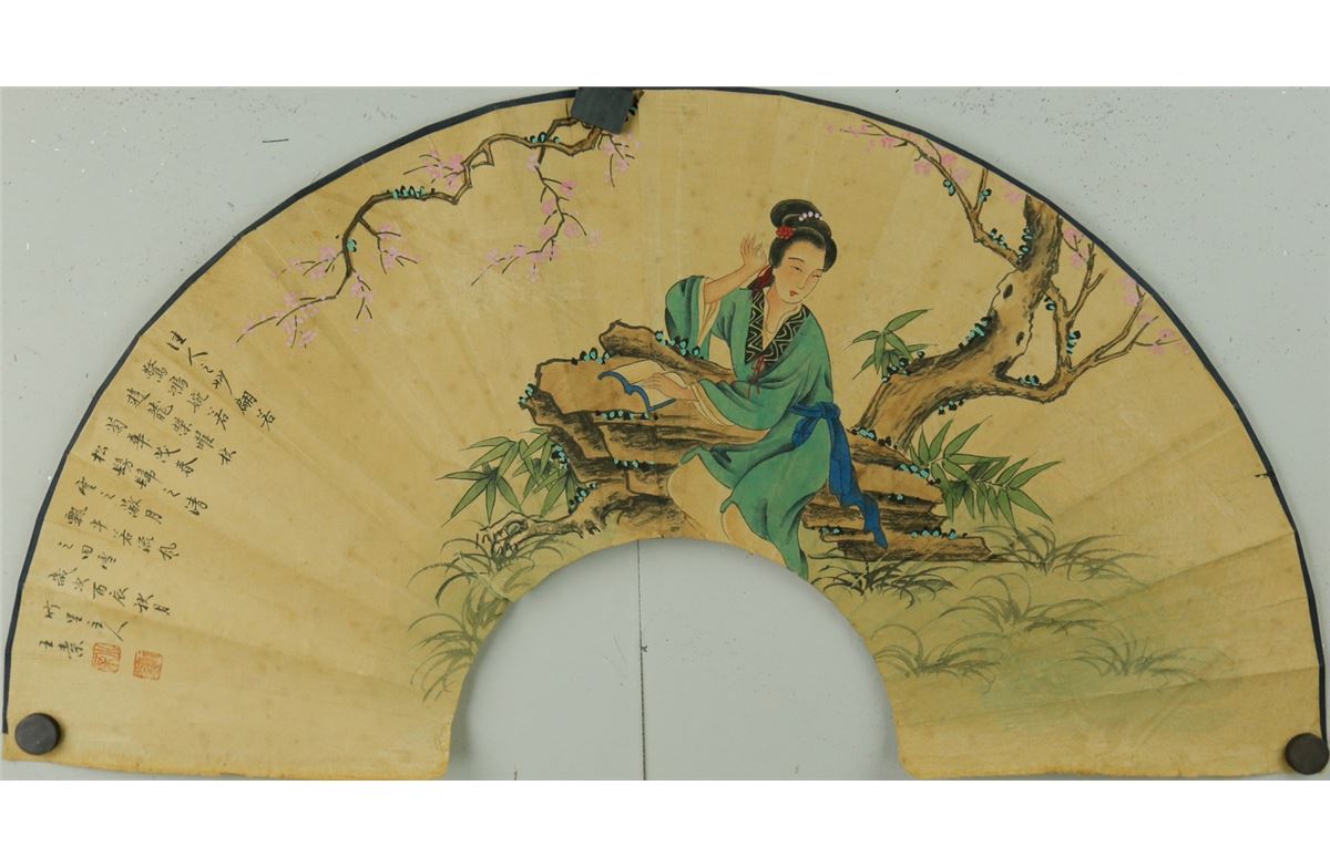 Lady in the courtyard, fan painting, Chinese ink and watercolour on paper, signed Wang Su with red seal. 23 cm x 61 cm.