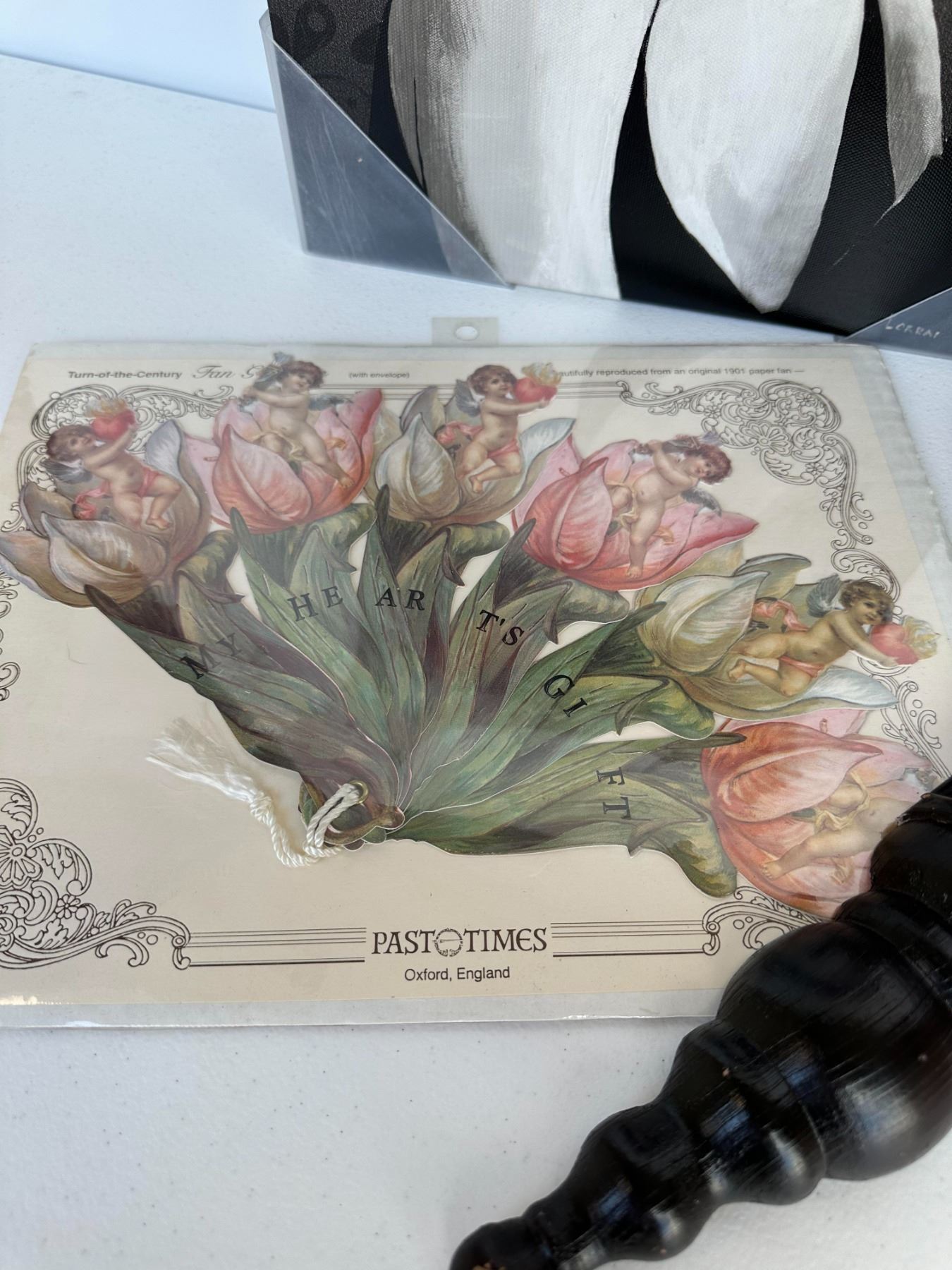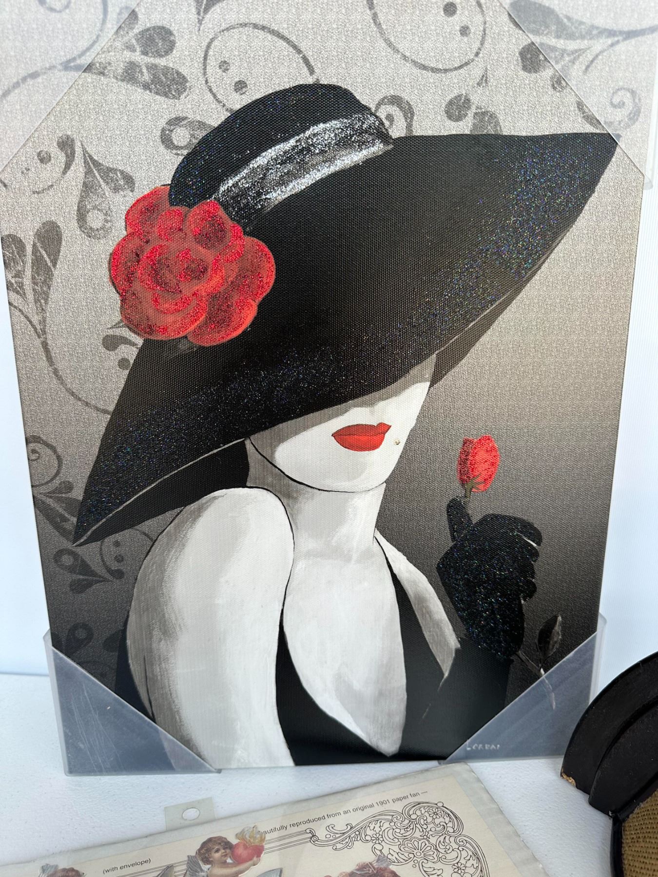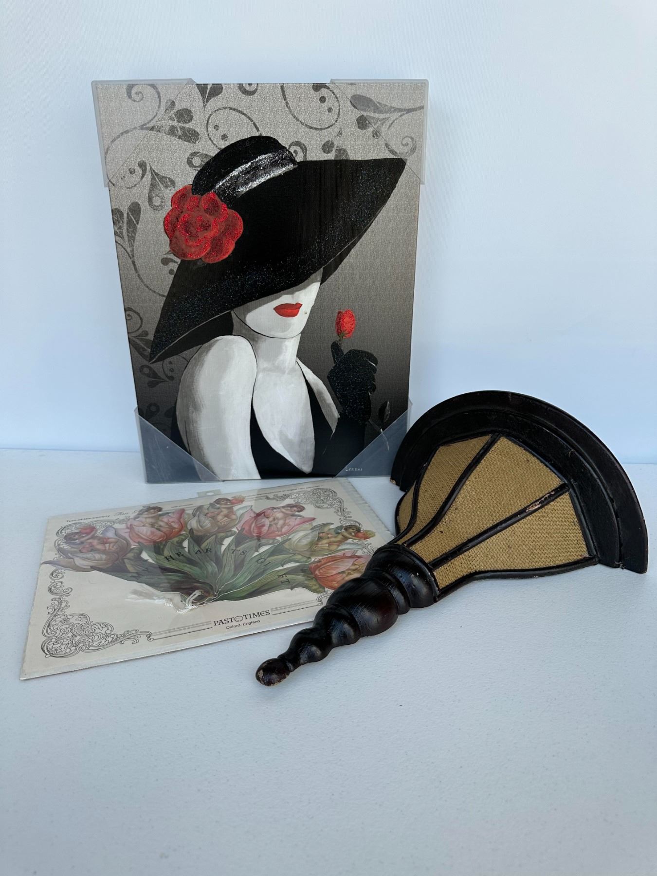 Decorative canvas art print of an elegant lady with red rose, a vintage Past Times tulip print, and a unique wooden wall sconce. Stylish décor trio.