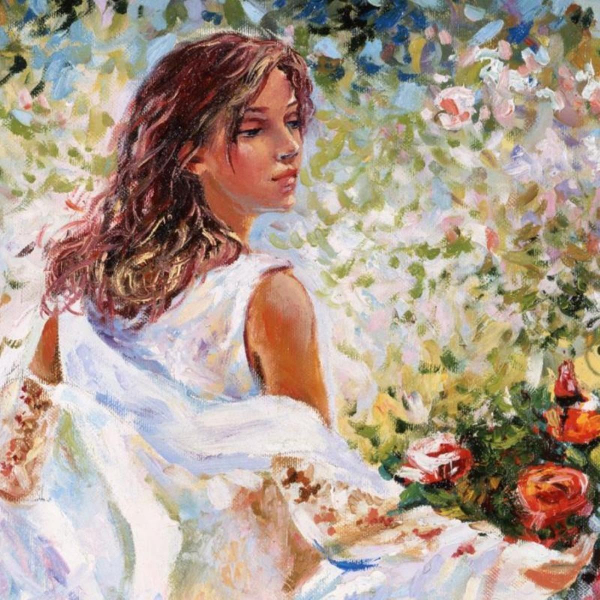 "Lady in White Dress" is a limited edition Giclee on Canvas by Igor Semeko. The piece is numbered, hand siged by the artist, and come with a letter of authenticity. Measures approximately 40" x 30".