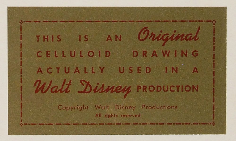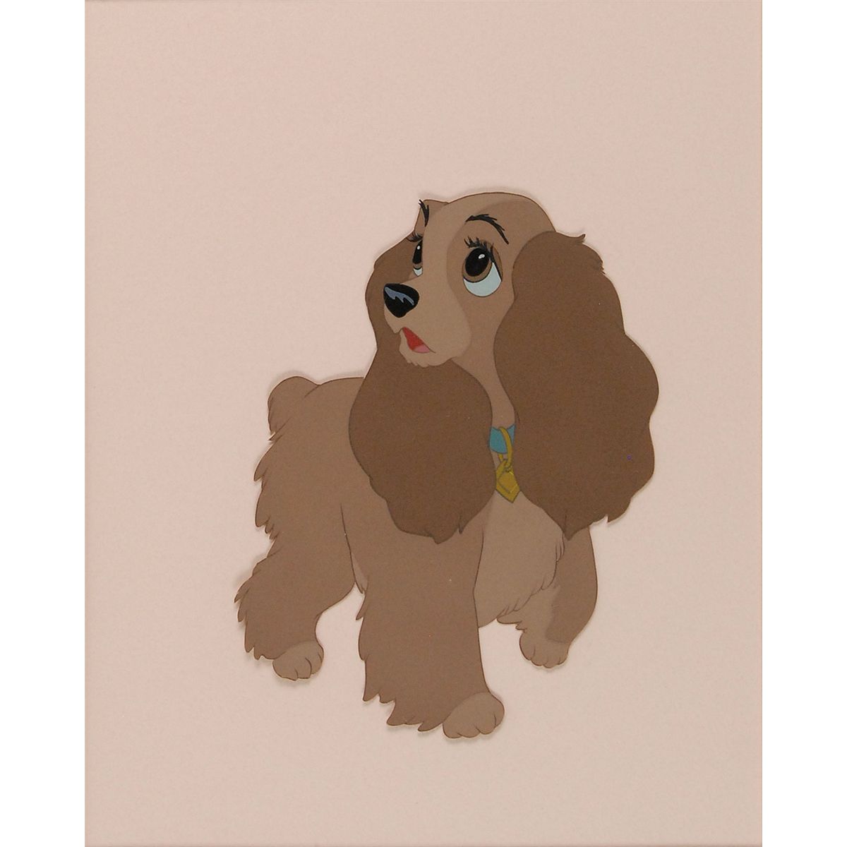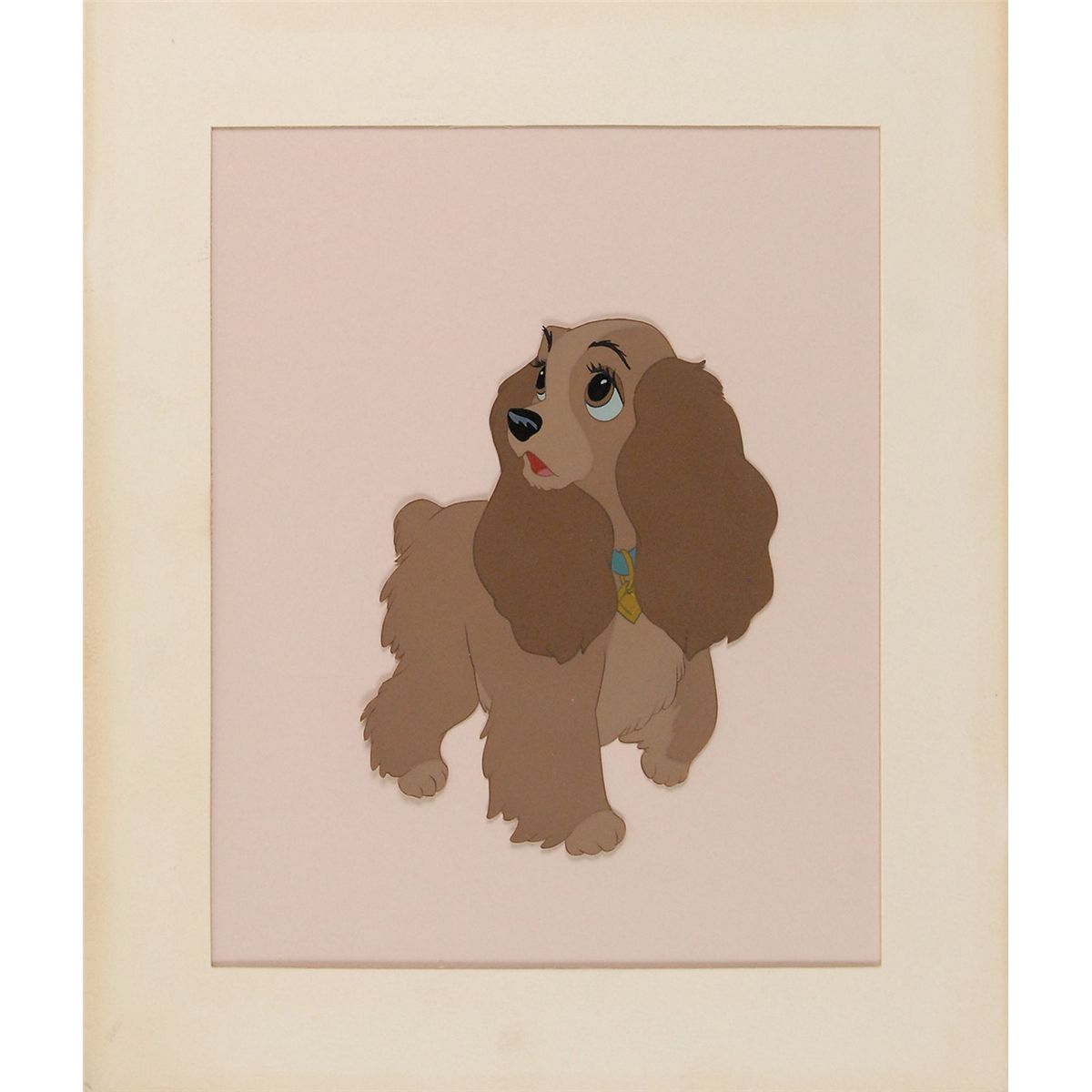 (Walt Disney Studios, 1955) Original production cel featuring Lady from Lady and the Tramp. Image measures 3.5 x 4.75, with a mat opening of 5.75 x 7.75. Mat dimensions are 8 x 9.5. Reverse bears an affixed Walt Disney Productions original celluloid drawing label and Disneyland Art Corner ink stamp. In fine condition.
