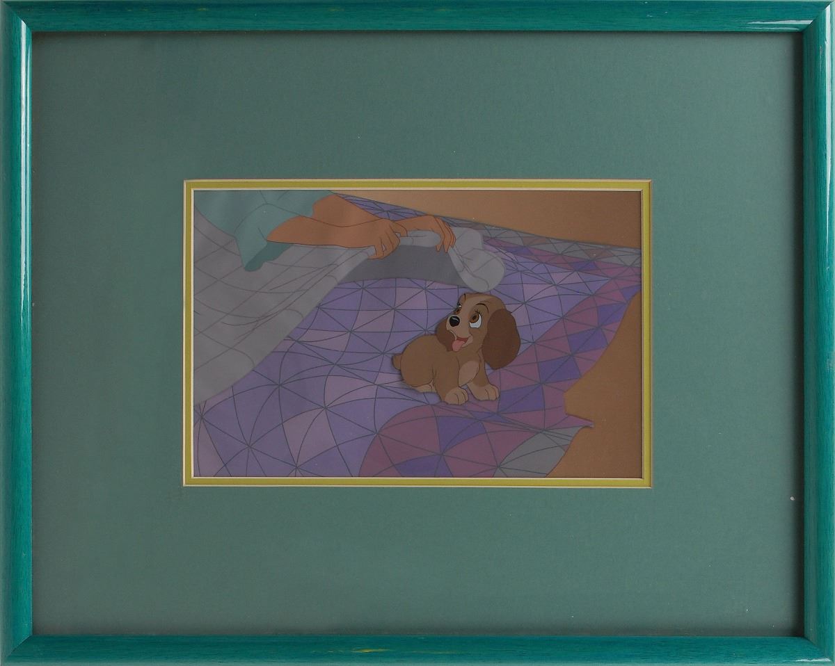 (Walt Disney Studios, 1955) Cute original production cel featuring Lady as a newborn puppy from the beginning of Lady and the Tramp, showing her on a large purple blanket. Blanket cels are trimmed to image; character image measures 3.25 x 2.75, with a mat opening of 11.25 x 7.25. This piece is also framed to an overall size of 21 x 17. In fine condition.