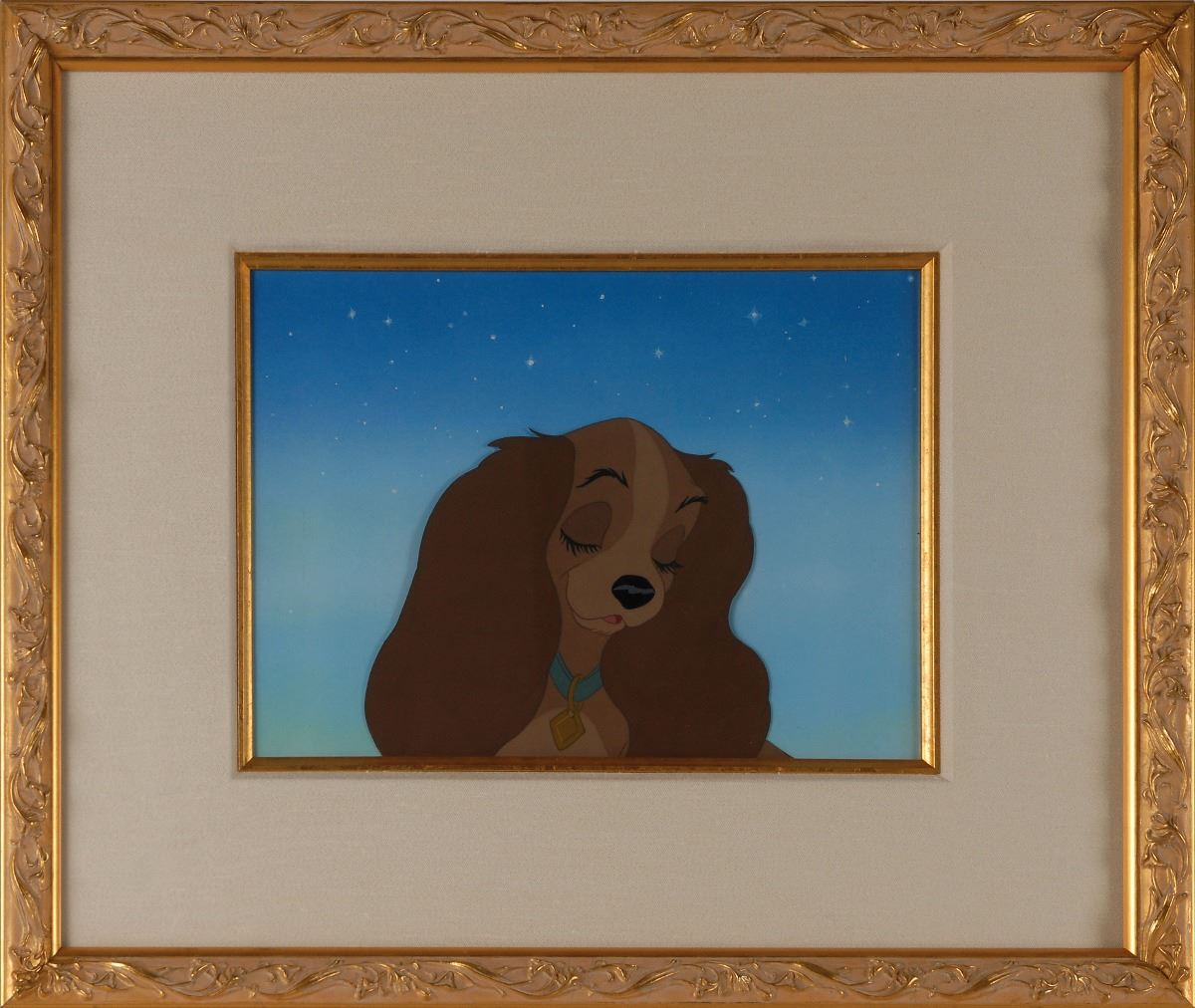 (Walt Disney Studios, 1955) Original production cel featuring Lady from Lady and the Tramp, showing her looking relaxed. The cel is placed on a Disney litho background. Image measures 6.5 x 5.5, with a mat opening of 10.75 x 7.75. This piece is also framed to an overall size of 19 x 16. In fine condition.