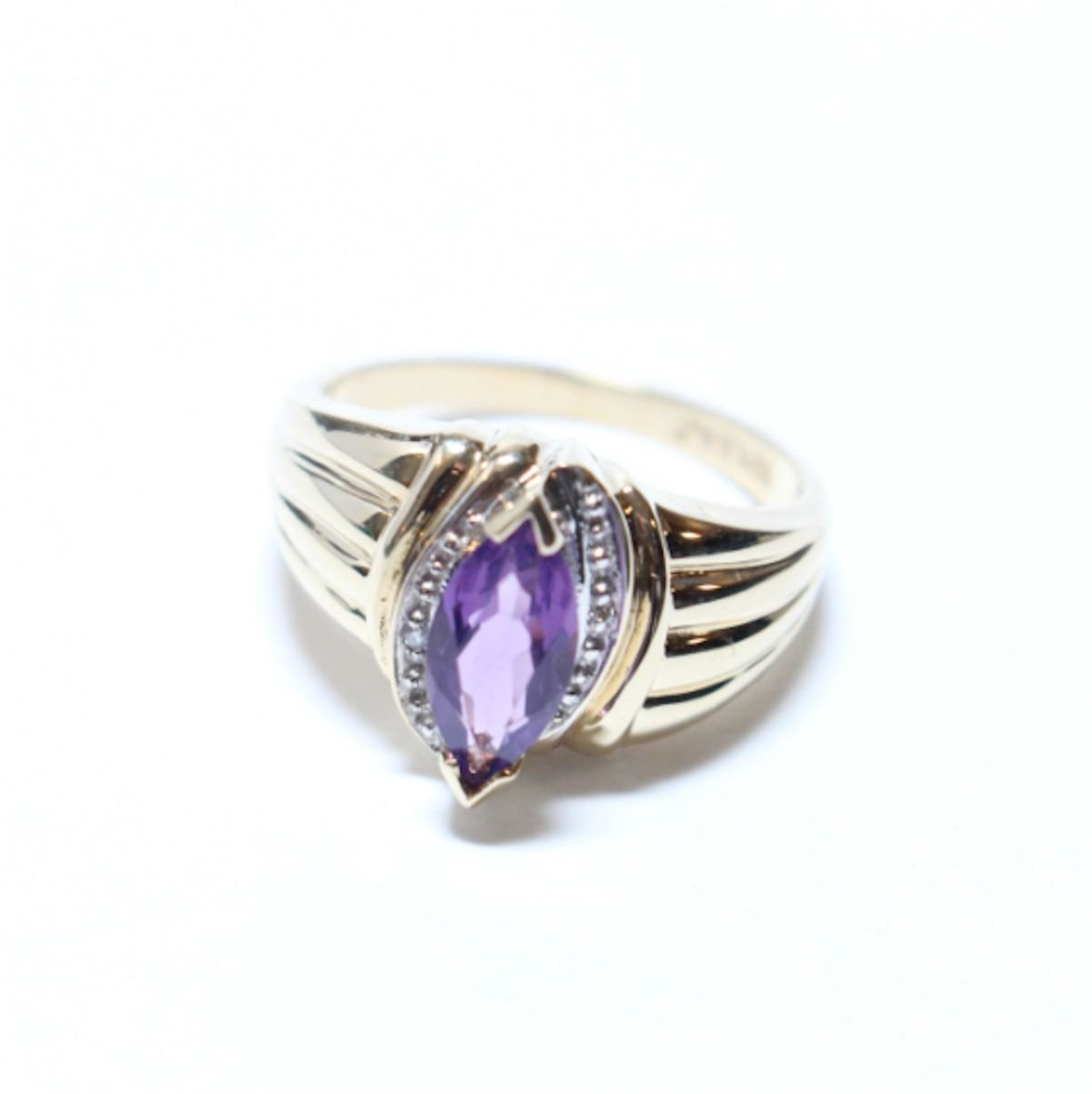 Lady's 10K Yellow Gold Amethyst Ring with Diamond Accents - Size 7. Total weight of 3.22 grams.