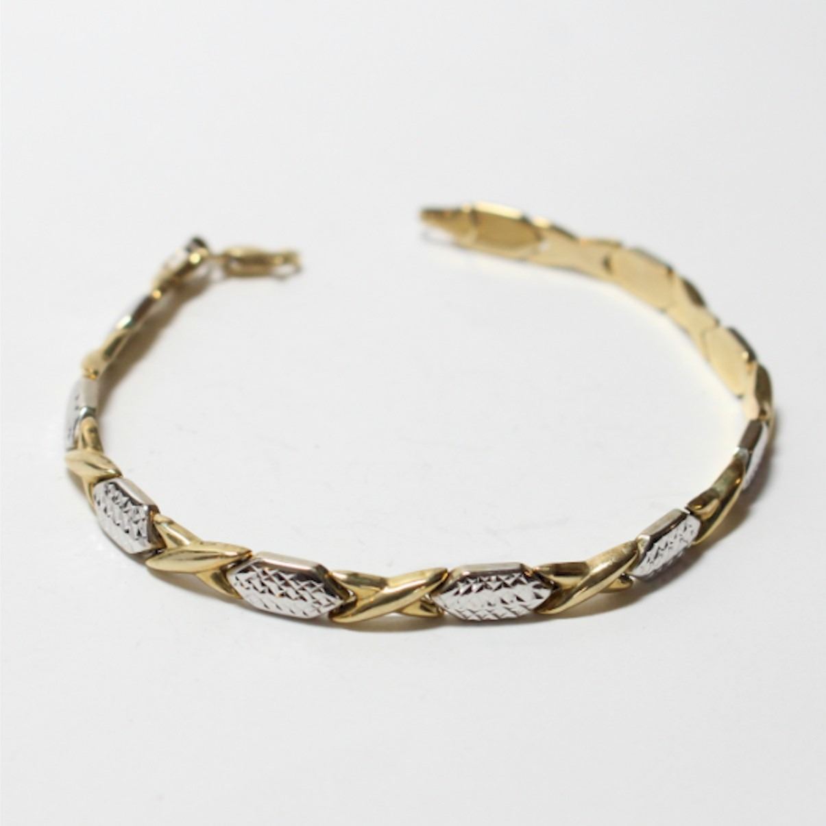 Lady's 10K Yellow & White Gold Fancy Link Bracelet with Lobster Clasp. Bracelet measures 7 1/2" in length with a total weight of 4.55 grams.