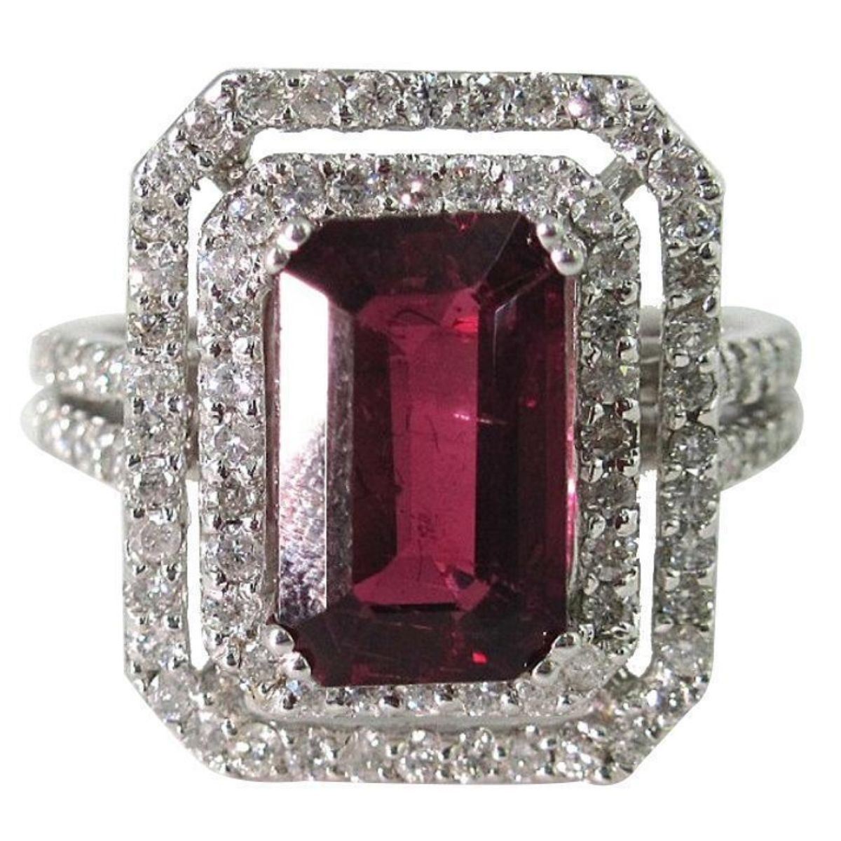 Lady's 14K white gold rubelite dinner ring, with a 3.25 carat emerald cut rubelite, on a diamond mounted frame, above a larger diamond mounted frame, total diamond wt, 1 carat.