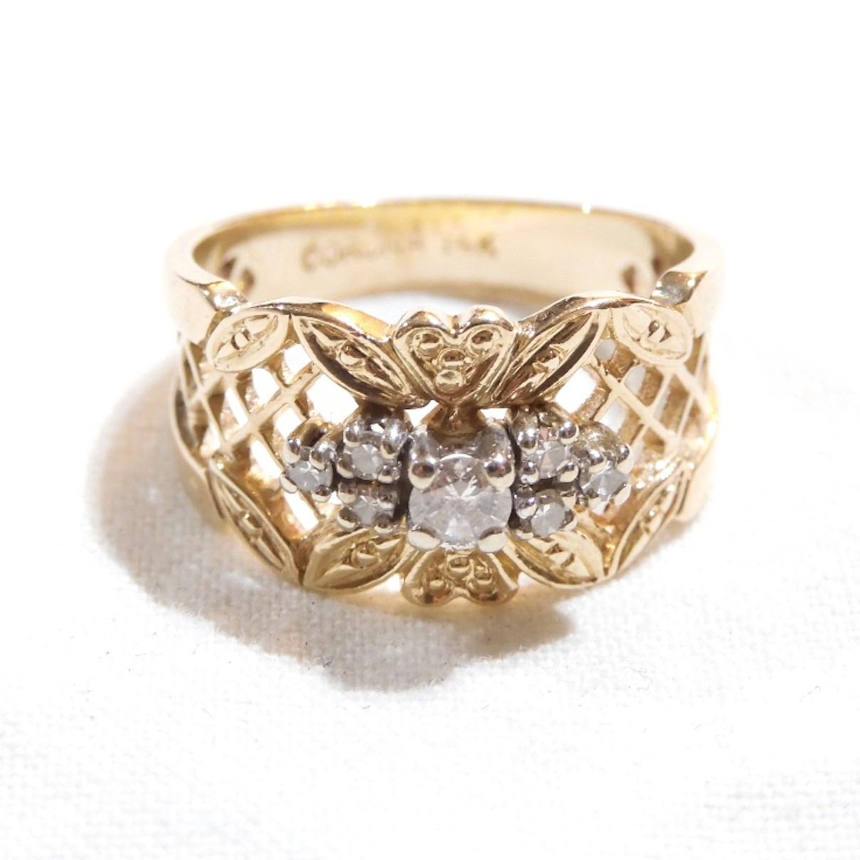 Lady's 14K Yellow & White Gold Diamond Ring with Open Work Band. Size 6 1/4. Total weight of 4.7 grams.