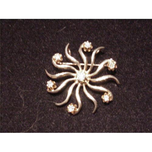 Pretty Circa 1930-40 14Kt yellow gold and diamond stylized sunburst brooch set with one full center diamond approx .10 ct and six single cut diamonds in the rays each weighing approx .04 ct for a total approximate diamond weight of .34 cts. Lovely piece. Reverse: safety catch, ball hinge, and ring on top which a chain can be run through so tht you could wear this as a pendant. Very pretty look. Great price!!