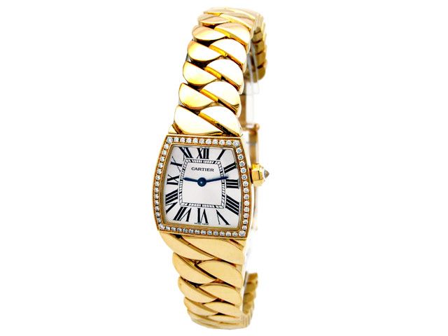 Lady's 18K Yellow Gold Cartier Dona Watch. **|**|** Lady's 18K Yellow Gold Cartier Dona Watch. Silver Roman Numeral Dial. 18k Yellow Gold Bezel with Diamonds. 18k Yellow Gold Band. Style WE60040H. ; MSRP: $41700