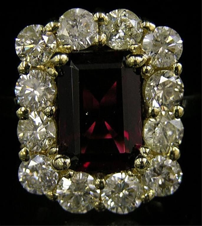 Lady's 18K Yellow Gold Rubelite Dinner Ring, with an emerald cut 3.25 carat rubelite within a border of 12 round diamonds, total diamond wt.- 3 cts.