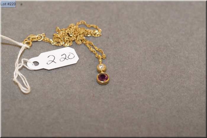 Lady's 18kt yellow gold, diamond and ruby pendant set with 0.36ct natural ruby and 0.07ct brilliant white accent diamond and an 18kt yellow gold neck chain. Retail replacement value $889.00