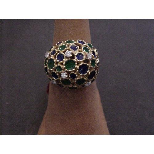 Cool Fun and Funky Circa 1960 14kt yellow gold, diamond and blue and green enamel dome shaped ring set with six modern cut diamonds approximate total weight of .25 cts accented with green and blue enamel in an abstract design. Great design. Wonderful condition. Currently a size 7 but will size once for customer at no charge.