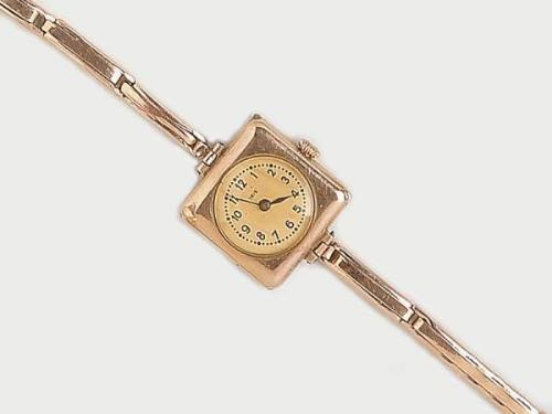 14 K gold, thin flexible bracelet, angular form case, face with Arabic numerals, Iris sign, cylinder watch in working condition, Switzerland, circa 1910, marked, gross weight 19.1 g, length: 15 cm, dented.