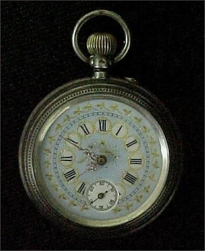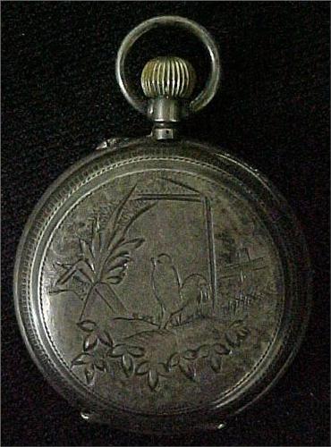 Lady's C. 1900 silver cased pendant watch with porcelain face; Roman numeral dial; marked 800 (silver); Ls. Jacot, No. 25170; Swiss movement; 1 3/8" diameter; back has engraved scene with roosters