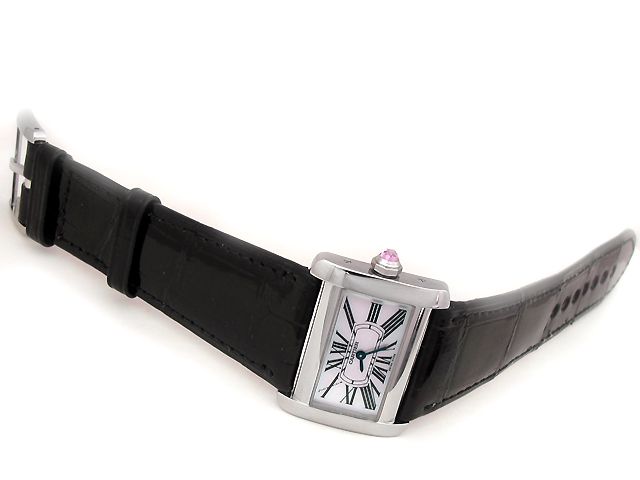Lady's Cartier Stainless Steel Tank Divan Watch **|**|** Lady's Cartier Stainless Steel Tank Divan Watch. Pink MOP Roman Numeral Dial. Stainless Steel Bezel. Black Leather Band. ; MSRP: $4900