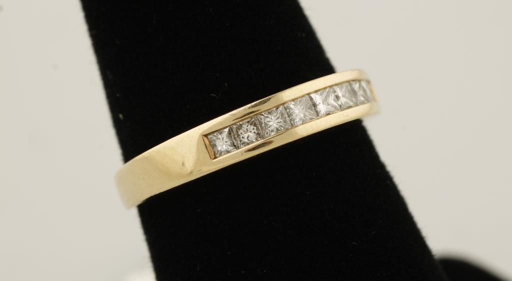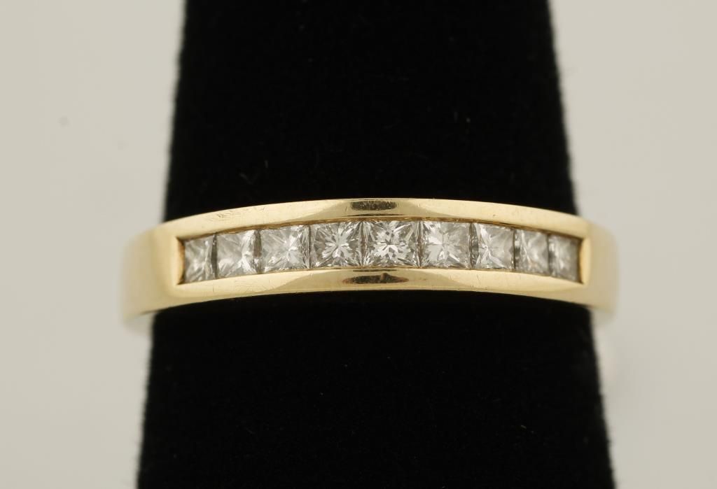 Diamond band. Princess cut. 90 center total weight stw. 14K yellow gold size 7.With 9 stones. Retails $2000.