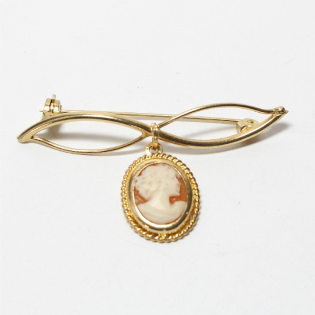 Lady's Edwardian 9K Yellow Gold Cameo Brooch. Length of the brooch measures 1" long by just under 2" wide. Total weight of 2.48 grams.