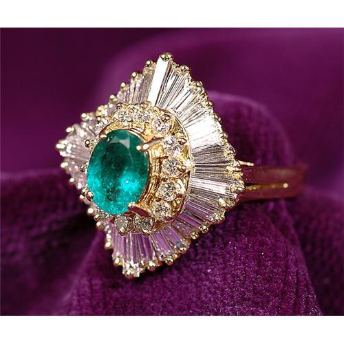 <Our item number 141148><B>Lady's Emerald, Diamond, 14K Yellow Gold Balerina Style Ring.</B> Centering one oval faceted emerald, weighing approximately 1.00 carat, surrounded by a row of 14 round full-cut and 32 tapered baguette-cut diamonds, all weighing a total of approximately 3.00 carats, gross weight 9.10 grams, ring size 8 3/4. Note: diamonds are VS1 to SI1 in clarity and G/H color, emerald is medium green in color. <BR>Estimated Value $2,500 - 3,500. <BR><BR>Our item number 141148<BR><IMAGES><P ALIGN="CENTER"><IMG SRC="http://www.goldbergcoins.net/liveauction/49jpegs/141148.jpg"> </P></IMAGES>