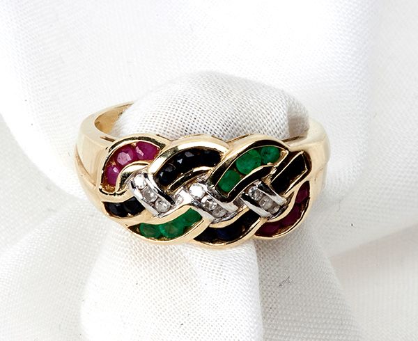 Lady's Emerald, Ruby, Sapphire, Diamond, 14K Yellow Gold Band Ring