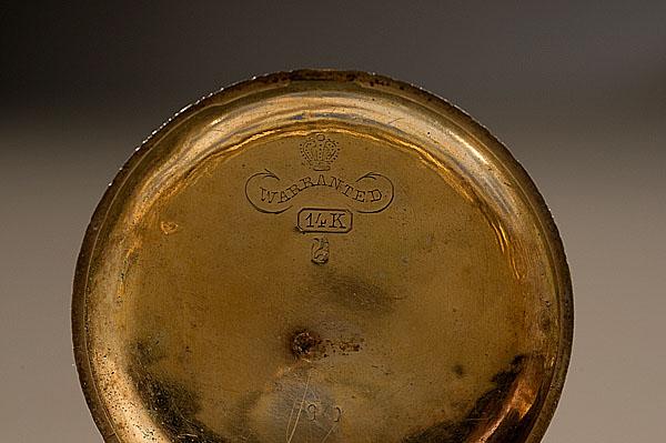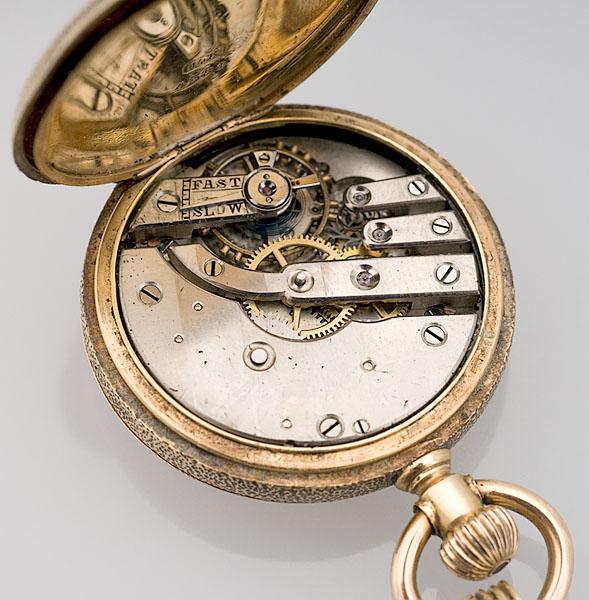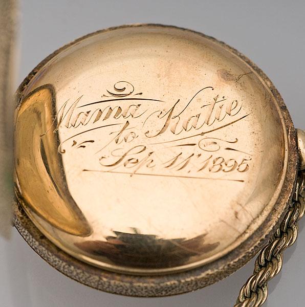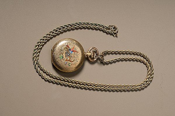 probably Swiss, late 19th century. A 14K gold lady's watch with enameled decoration of a bird defending its nest from a snake, engraved on cuvette Mama to Katie, Sep 11 1895. Enameled dial and gold filigree hands. Stem wind; case approximately 1.3125" diameter.