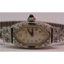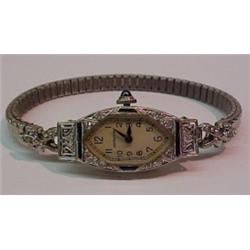 Lady's Hamilton white gold and diamond wrist watch, Art Deco style 18K white gold case set with ten diamonds, approximately 2.5 points each, blue stone dial and baguettes, two as is, case is marked inside 18K, platinum top, 17 jewel movement, Hamilton #911, Speidel band