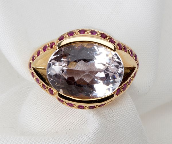 Lady's Kunzite, Ruby, 14k Yellow Gold Ring. Centering one oval faceted kunzite, measuring 16.00 x 12.00 mm., 1/2 bezel set, enhanced by round rubies, gross weight 12.80 grams.