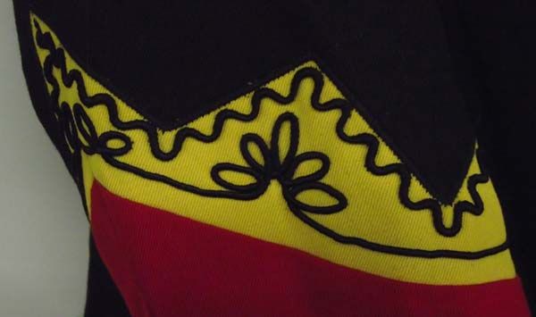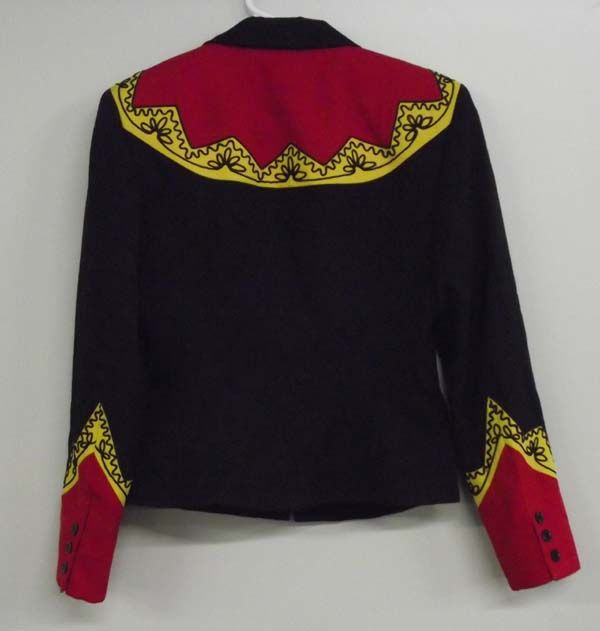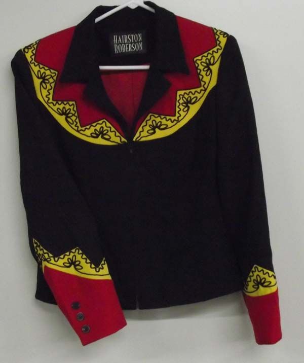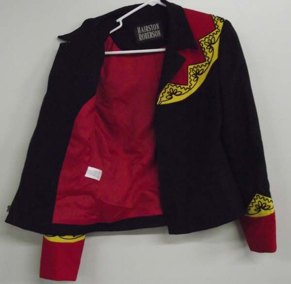 Lady's Lined Wool Jacket by Hairston Roberson. Black with red and gold designs, this size 2 jacket is a stunner. Front zipper. Cleaning tag inside. Made in the USA!