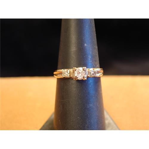 Pretty lady's Circa 1930 14kt yellow gold and diamond ring set with one .20 ct brilliant cut center diamond and .04 cts in side diamonds set in a 14kt yellow gold mount (diamonds set in white gold top). Very sweet look.