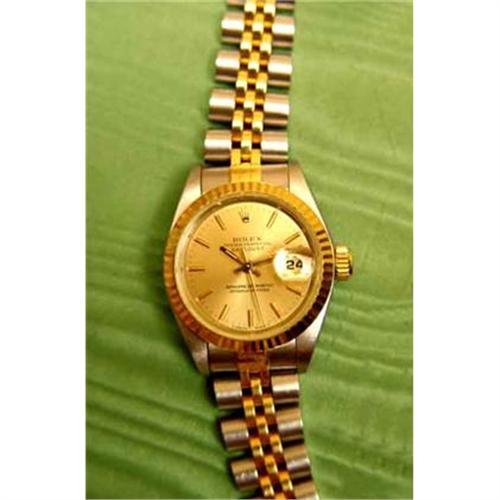 <tr><td>Title:Lady's ROLEX Datejust Quickset 14kt Gold/SS</td></tr>