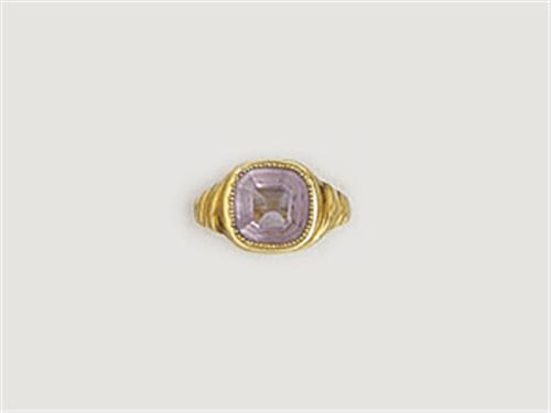 18 K gold, caul type 1 light colour amethyst decoration, last third 19th century, marked, diameter: 16 mm, weight: 7.3 g, worn, tightened shank.