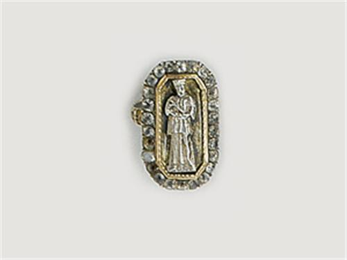 Silver, partly gold plated, longish rectangular form head with cut corners, depicting Saint Ignatius from Loyola, closed set mountain crystals in cluster, circa 1900, marked, diameter: 18.2 mm, weight: 7.8 g, 1 stone is replaced by diamond.